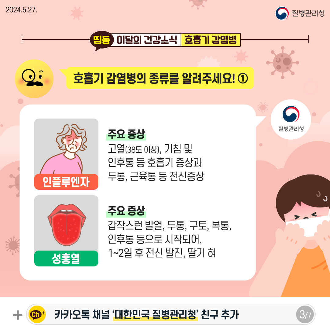 6월이 지나가고 무더위가 일찌감치 찾아왔습니다. 그런데 이상하게도 주변에 감기 환자가 많은 것 같습니다. 다들 냉방병이라고도 하고 어디서 옮았다고도 하는데 오뉴월 감기는 개도 안 걸린다는데 왜 이리 감기 환자가 많아지는 걸까요? 질병관리청에서 호흡기 감염병을 조심하자는 홍보를 하길래 알아봤습니다. 지금 감기 중이시라면 알려드리는 호흡기 감염병의 증상과 비교해 보시고 당장 병원을 찾으시게 좋을 듯하여 알려드립니다. 호흡기 감염병은 어떤 것들이 있을까요?